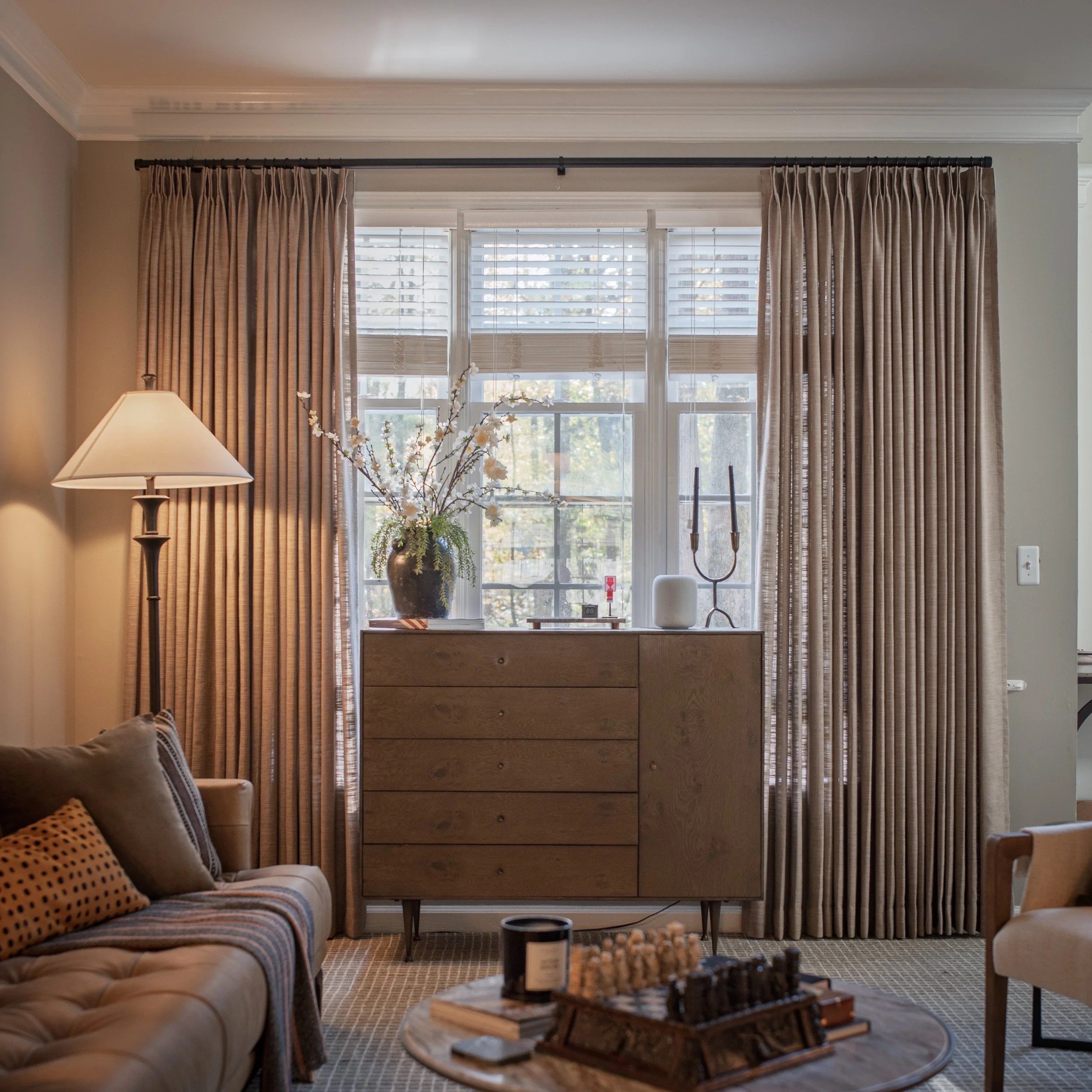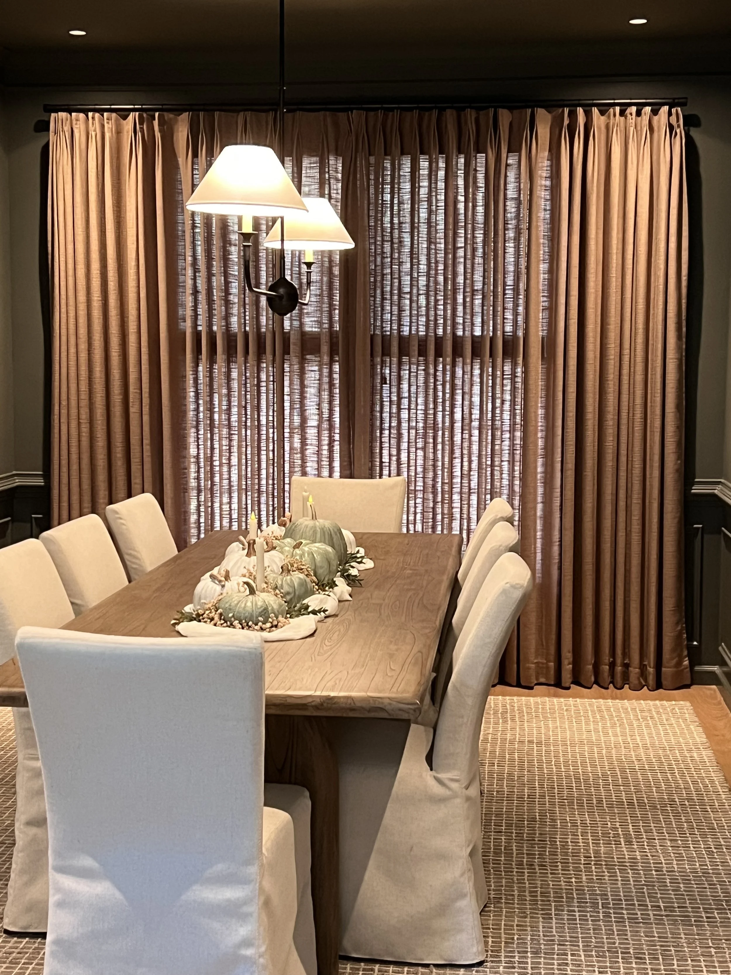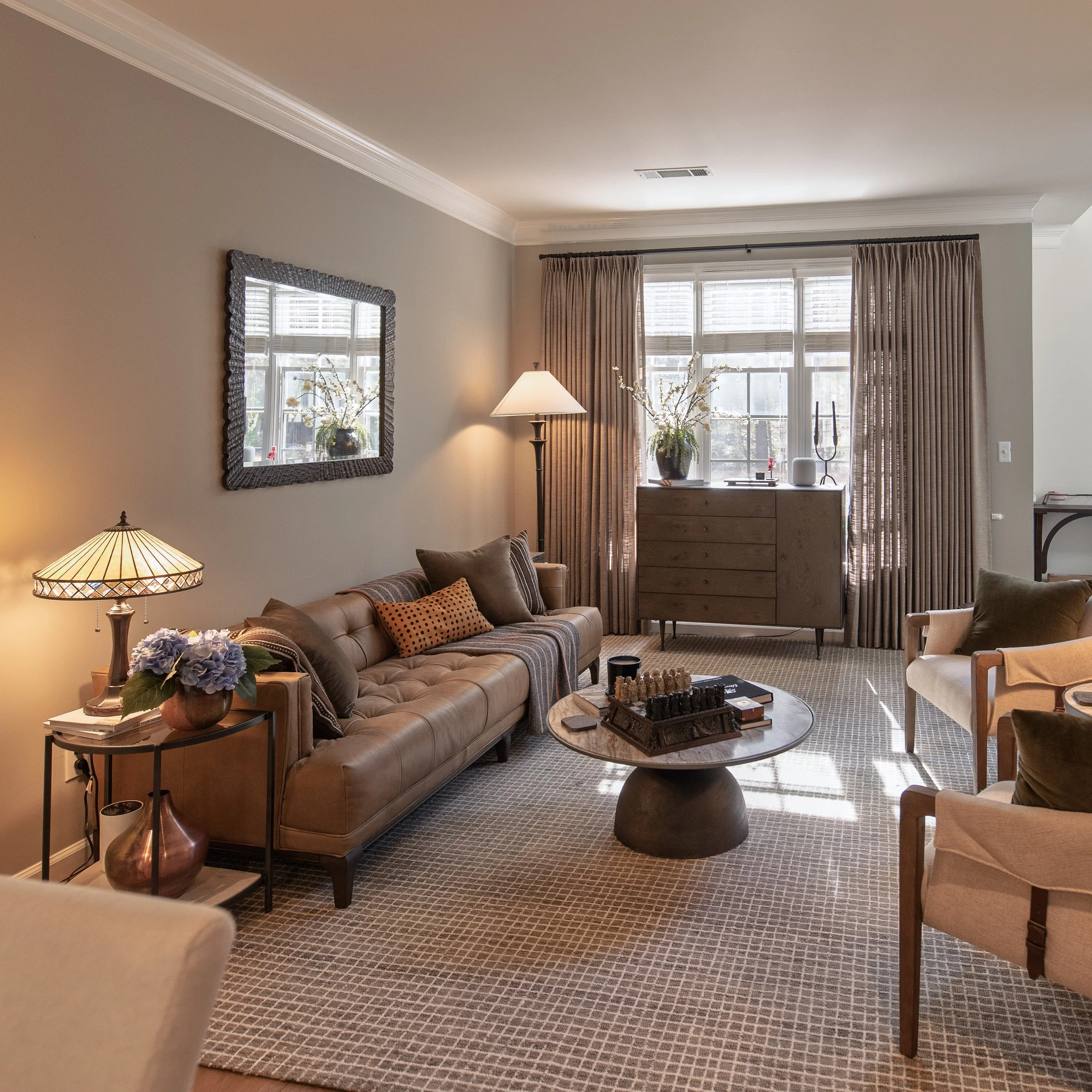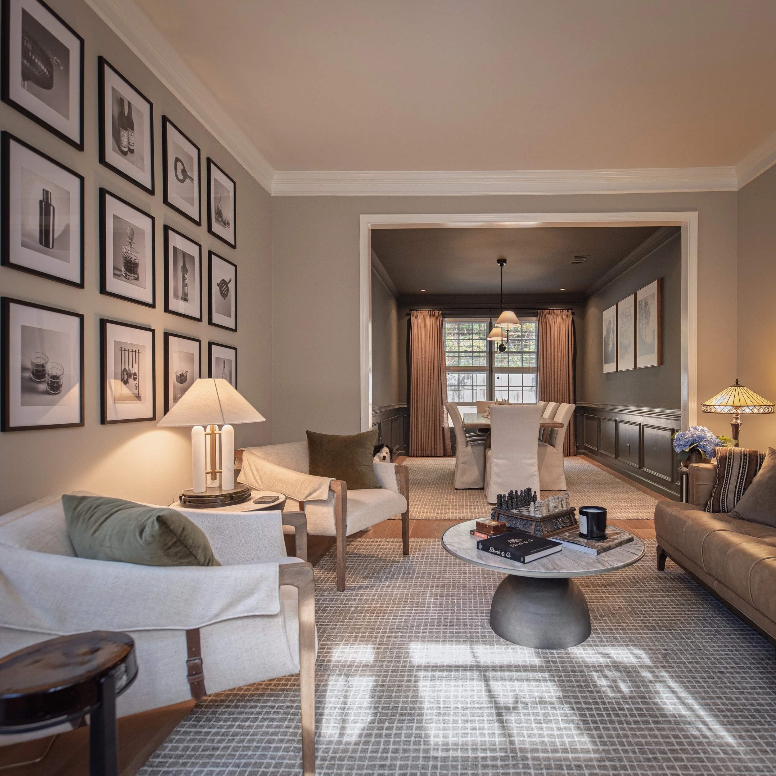 Our Party Hosts Were Looking For Warm, Moody and Masculine in this Den, Dining and Great Room. We Flooded the Dining Room with A Deep, Bold Paint Paired with Rich Wood Tones and Soft Linens for An Intimate Dining Experience. We Counter Balanced The Den Using Mixed Materials of Leather, Linens, Metals,